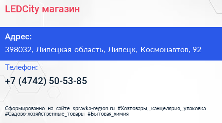 LEDCity, магазин по адресу 398032, Липецкая область, Липецк, Космонавтов, 92 в дальнейшем Организация, размещена в следующих категориях: