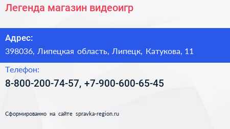 Легенда, магазин видеоигр по адресу 398036, Липецкая область, Липецк, Катукова, 11 в дальнейшем Организация, размещена в следующих категориях: