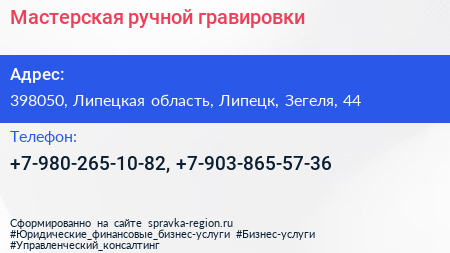 Мастерская ручной гравировки по адресу 398050, Липецкая область, Липецк, Зегеля, 44 в дальнейшем Организация, размещена в следующих категориях: