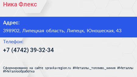 Ника Флекс по адресу 398902, Липецкая область, Липецк, Юношеская, 43 в дальнейшем Организация, размещена в следующих категориях: