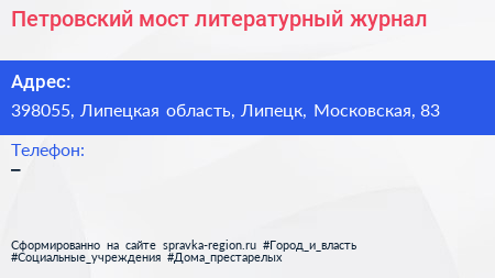 Петровский мост, литературный журнал по адресу 398055, Липецкая область, Липецк, Московская, 83 в дальнейшем Организация, размещена в следующих категориях: