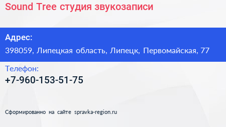 Sound Tree, студия звукозаписи по адресу 398059, Липецкая область, Липецк, Первомайская, 77 в дальнейшем Организация, размещена в следующих категориях: