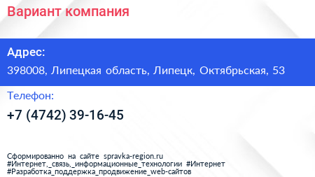 Вариант, компания по адресу 398008, Липецкая область, Липецк, Октябрьская, 53 в дальнейшем Организация, размещена в следующих категориях:
