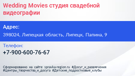 Wedding Movies, студия свадебной видеографии по адресу 398024, Липецкая область, Липецк, Папина, 9 в дальнейшем Организация, размещена в следующих категориях: