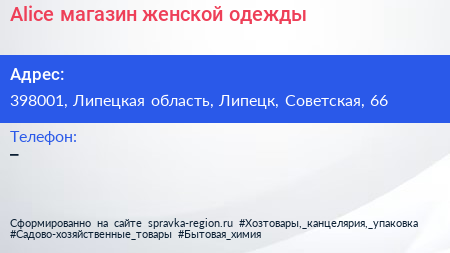 Alice, магазин женской одежды по адресу 398001, Липецкая область, Липецк, Советская, 66 в дальнейшем Организация, размещена в следующих категориях: