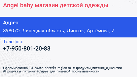 Angel baby, магазин детской одежды по адресу 398070, Липецкая область, Липецк, Артёмова, 7 в дальнейшем Организация, размещена в следующих категориях:
