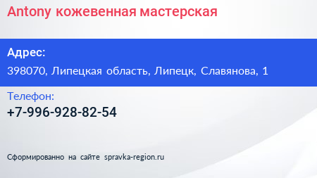 Antony, кожевенная мастерская по адресу 398070, Липецкая область, Липецк, Славянова, 1 в дальнейшем Организация, размещена в следующих категориях: