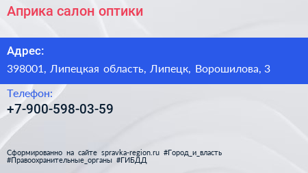 Априка, салон оптики по адресу 398001, Липецкая область, Липецк, Ворошилова, 3 в дальнейшем Организация, размещена в следующих категориях: