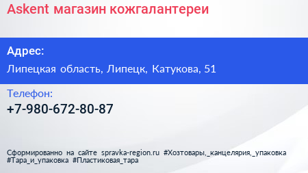 Askent, магазин кожгалантереи по адресу Липецкая область, Липецк, Катукова, 51 в дальнейшем Организация, размещена в следующих категориях: