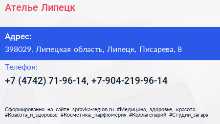 Ателье-Липецк по адресу 398029, Липецкая область, Липецк, Писарева, 8 в дальнейшем Организация, размещена в следующих категориях: