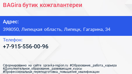 BAGira, бутик кожгалантереи по адресу 398050, Липецкая область, Липецк, Гагарина, 34 в дальнейшем Организация, размещена в следующих категориях:
