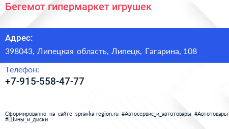 Бегемот, гипермаркет игрушек по адресу 398043, Липецкая область, Липецк, Гагарина, 108 в дальнейшем Организация, размещена в следующих категориях: