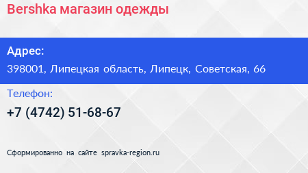 Bershka, магазин одежды по адресу 398001, Липецкая область, Липецк, Советская, 66 в дальнейшем Организация, размещена в следующих категориях: