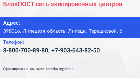 БлокПОСТ, сеть экипировочных центров по адресу 398016, Липецкая область, Липецк, Терешковой, 6 в дальнейшем Организация, размещена в следующих категориях: