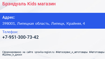 Брэндуаль Kids, магазин по адресу 398001, Липецкая область, Липецк, Крайняя, 4 в дальнейшем Организация, размещена в следующих категориях: