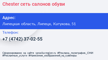 Chester, сеть салонов обуви по адресу Липецкая область, Липецк, Катукова, 51 в дальнейшем Организация, размещена в следующих категориях: