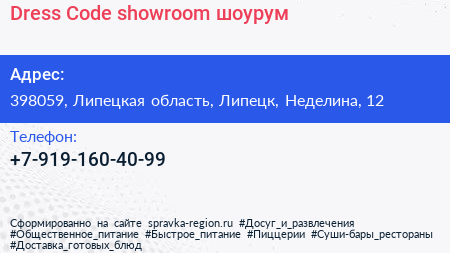 Dress Code showroom, шоурум по адресу 398059, Липецкая область, Липецк, Неделина, 12 в дальнейшем Организация, размещена в следующих категориях: