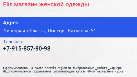 Elis, магазин женской одежды по адресу Липецкая область, Липецк, Катукова, 51 в дальнейшем Организация, размещена в следующих категориях: