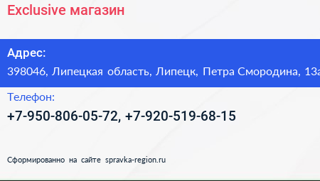 Exclusive, магазин по адресу 398046, Липецкая область, Липецк, Петра Смородина, 13а в дальнейшем Организация, размещена в следующих категориях: