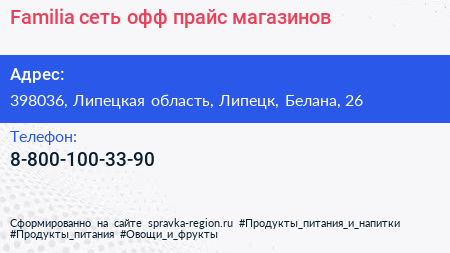 Familia, сеть офф-прайс магазинов по адресу 398036, Липецкая область, Липецк, Белана, 26 в дальнейшем Организация, размещена в следующих категориях: