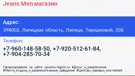 Jeans Men, магазин по адресу 398002, Липецкая область, Липецк, Терешковой, 35Б в дальнейшем Организация, размещена в следующих категориях:
