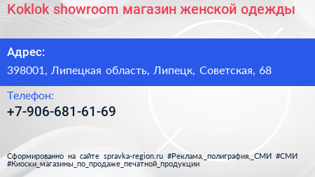 Koklok showroom, магазин женской одежды по адресу 398001, Липецкая область, Липецк, Советская, 68 в дальнейшем Организация, размещена в следующих категориях: