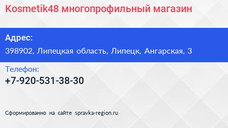 Kosmetik48, многопрофильный магазин по адресу 398902, Липецкая область, Липецк, Ангарская, 3 в дальнейшем Организация, размещена в следующих категориях: