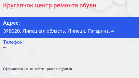 Круглячок, центр ремонта обуви по адресу 398020, Липецкая область, Липецк, Гагарина, 4 в дальнейшем Организация, размещена в следующих категориях: