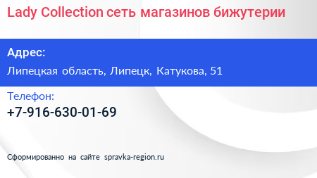 Lady Collection, сеть магазинов бижутерии по адресу Липецкая область, Липецк, Катукова, 51 в дальнейшем Организация, размещена в следующих категориях:
