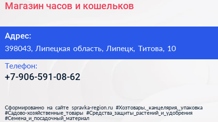 Магазин часов и кошельков по адресу 398043, Липецкая область, Липецк, Титова, 10 в дальнейшем Организация, размещена в следующих категориях: