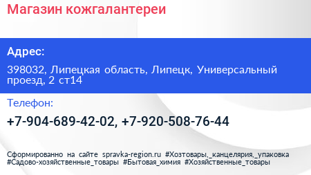 Магазин кожгалантереи по адресу 398032, Липецкая область, Липецк, Универсальный проезд, 2 ст14 в дальнейшем Организация, размещена в следующих категориях: