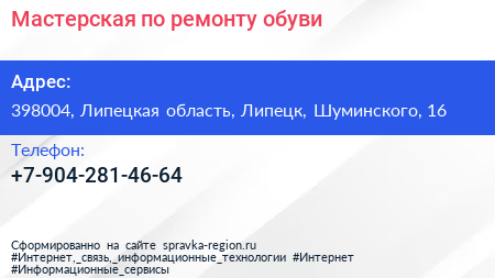 Мастерская по ремонту обуви по адресу 398004, Липецкая область, Липецк, Шуминского, 16 в дальнейшем Организация, размещена в следующих категориях: