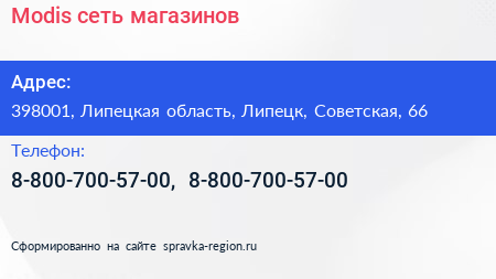 Modis, сеть магазинов по адресу 398001, Липецкая область, Липецк, Советская, 66 в дальнейшем Организация, размещена в следующих категориях:
