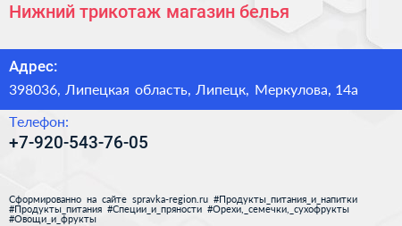 Нижний трикотаж, магазин белья по адресу 398036, Липецкая область, Липецк, Меркулова, 14а в дальнейшем Организация, размещена в следующих категориях: