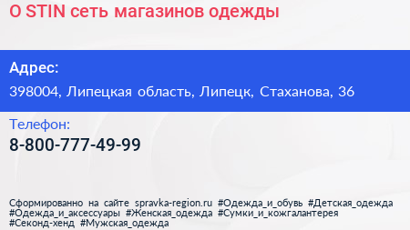 O`STIN, сеть магазинов одежды по адресу 398004, Липецкая область, Липецк, Стаханова, 36 в дальнейшем Организация, размещена в следующих категориях: