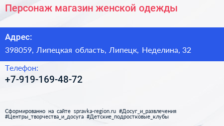 Персонаж, магазин женской одежды по адресу 398059, Липецкая область, Липецк, Неделина, 32 в дальнейшем Организация, размещена в следующих категориях: