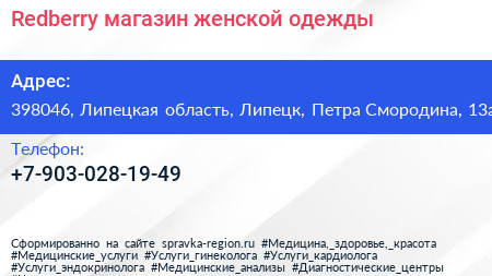 Redberry, магазин женской одежды по адресу 398046, Липецкая область, Липецк, Петра Смородина, 13а в дальнейшем Организация, размещена в следующих категориях: