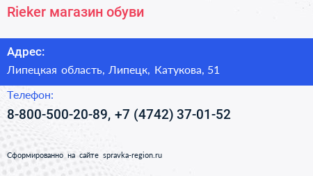 Rieker, магазин обуви по адресу Липецкая область, Липецк, Катукова, 51 в дальнейшем Организация, размещена в следующих категориях: