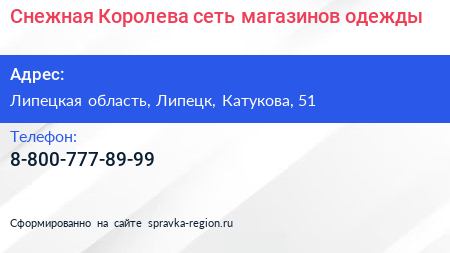 Снежная Королева, сеть магазинов одежды по адресу Липецкая область, Липецк, Катукова, 51 в дальнейшем Организация, размещена в следующих категориях: