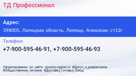 ТД Профессионал по адресу 398005, Липецкая область, Липецк, Алмазная, ст12г в дальнейшем Организация, размещена в следующих категориях: