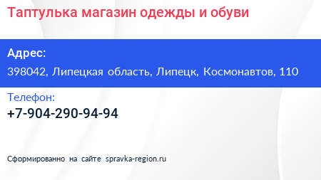 Таптулька, магазин одежды и обуви по адресу 398042, Липецкая область, Липецк, Космонавтов, 110 в дальнейшем Организация, размещена в следующих категориях: