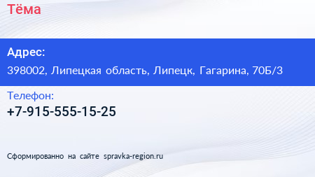 Тёма по адресу 398002, Липецкая область, Липецк, Гагарина, 70Б/3 в дальнейшем Организация, размещена в следующих категориях: