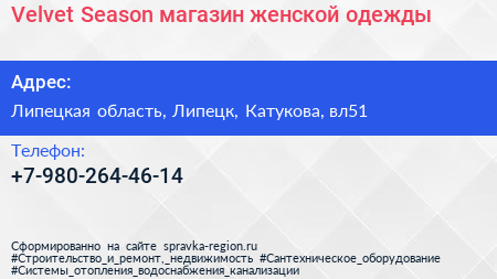 Velvet Season, магазин женской одежды по адресу Липецкая область, Липецк, Катукова, вл51 в дальнейшем Организация, размещена в следующих категориях: