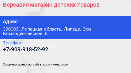 Версавия, магазин детских товаров по адресу 398005, Липецкая область, Липецк, Зои Космодемьянской, 8 в дальнейшем Организация, размещена в следующих категориях:
