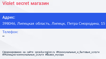 Violet secret, магазин по адресу 398046, Липецкая область, Липецк, Петра Смородина, 15 в дальнейшем Организация, размещена в следующих категориях: