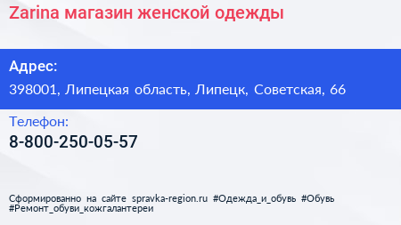 Zarina, магазин женской одежды по адресу 398001, Липецкая область, Липецк, Советская, 66 в дальнейшем Организация, размещена в следующих категориях: