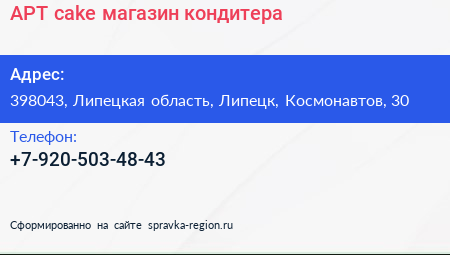 АРТ cake, магазин кондитера по адресу 398043, Липецкая область, Липецк, Космонавтов, 30 в дальнейшем Организация, размещена в следующих категориях: