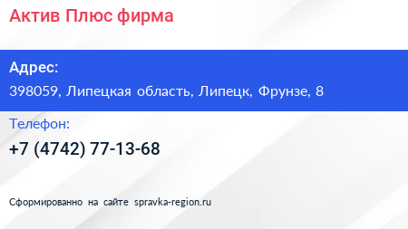 Актив-Плюс, фирма по адресу 398059, Липецкая область, Липецк, Фрунзе, 8 в дальнейшем Организация, размещена в следующих категориях: