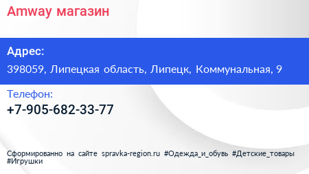Amway, магазин по адресу 398059, Липецкая область, Липецк, Коммунальная, 9 в дальнейшем Организация, размещена в следующих категориях: