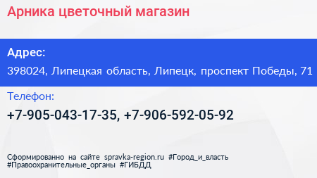 Арника, цветочный магазин по адресу 398024, Липецкая область, Липецк, проспект Победы, 71 в дальнейшем Организация, размещена в следующих категориях: